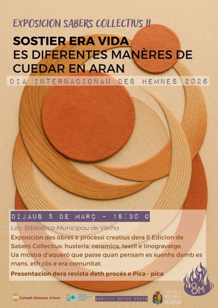 El 5 de març, a partir de les 18.30 h, la Biblioteca General de Vielha acollirà l’exposició de les obres i processos creatius de la 2a edició del projecte “Sabers Col·lectius”, en diversos àmbits: fusteria, ceràmica, tèxtil i linogravat. Es tracta d’una mostra del que passa quan pensem les cures amb les mans, el cos i la comunitat. També es presentarà una revista del procés que hi ha hagut, i es clourà l’acte amb un aperitiu.