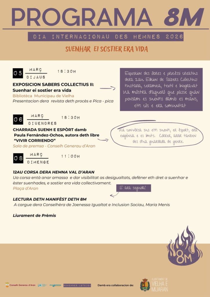 Per acabar, el 8 de març, a les 11.00 h, amb sortida i arribada a la Plaça d’Aran, se celebrarà la 12a Cursa de la Dona de la Val d’Aran. Una cursa que ja és un clàssic d’aquesta jornada reivindicativa i que busca reunir i visibilitzar les desigualtats, defensar el dret a cuidar i a ser cuidades, i sostenir la vida col·lectivament. I, en acabar la cursa, la consellera de Joventut, Igualtat i Inclusió Social, Maria Menis, llegirà el manifest del 8-M i, per tancar els actes d’enguany, es lliuraran els premis de la cursa.