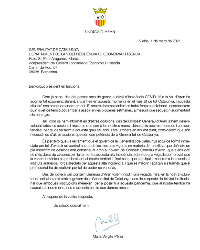 El passat 22 de febrer, la síndica d’Aran, Maria Vergés, va demanar al departament de Salut de la Generalitat informació sobre la previsió de les mesures a aplicar a l’Aran davant l’augment de contagis, i va sol·licitar accelerar el procés de vacunació. Tot i que, de moment, el Conselh Generau d’Aran no ha rebut resposta a aquestes peticions, el divendres dia 26, el govern de la Generalitat de Catalunya anunciava en roda de premsa que no tenia previstes mesures específiques per a la Val d’Aran. Davant aquesta informació, la síndica d’Aran s’ha dirigit novament a la Generalitat, concretament als consellers de Salut, Interior, Educació i Presidència, així com al president en funcions, per a reclamar que estableixin mesures urgents per a frenar l’alta incidència de COVID-19 a la Val d’Aran.