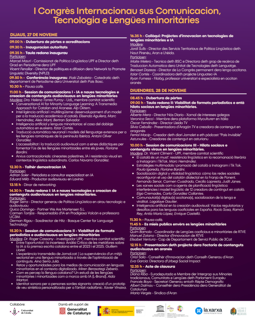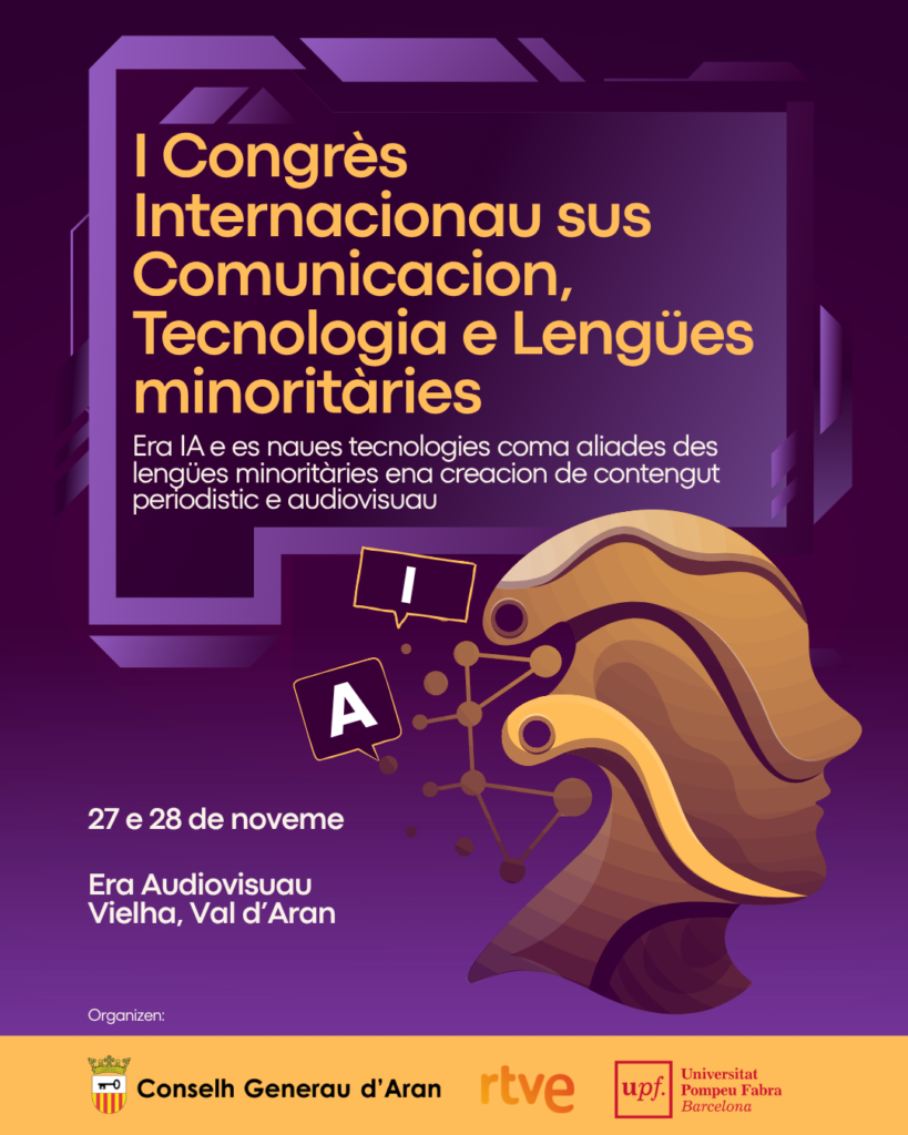 Eth Conselh Generau d’Aran, eth Departament de Comunicacion dera Universitat Pompeu Fabra, damb eth Grop de Recèrca en Comunicacion Politica, Jornalisme e Democràcia POLCOM-GRP, e RTVE organizen eth Prumèr Congrès Internacionau sus Comunicacion, Tecnologia e Lengües Minoritàries, qu’aurà lòc es dies 27 e 28 de noveme de 2025, ena Audiovisuau de Vielha (Val d’Aran).