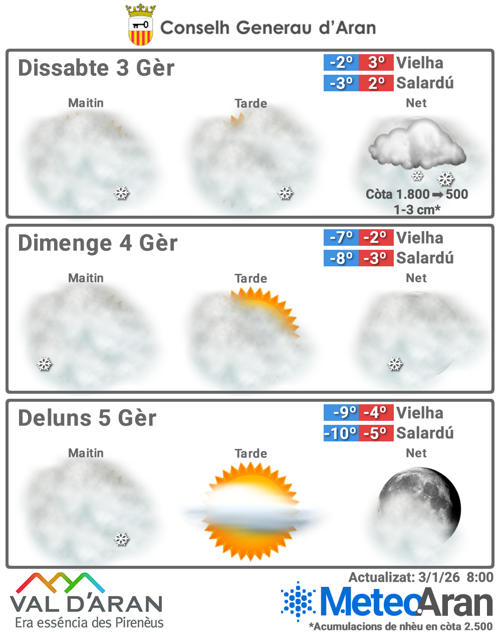 🌡️ –2 °C / 3 °C en Vielha · –3 °C / 2 °C en Salardú.