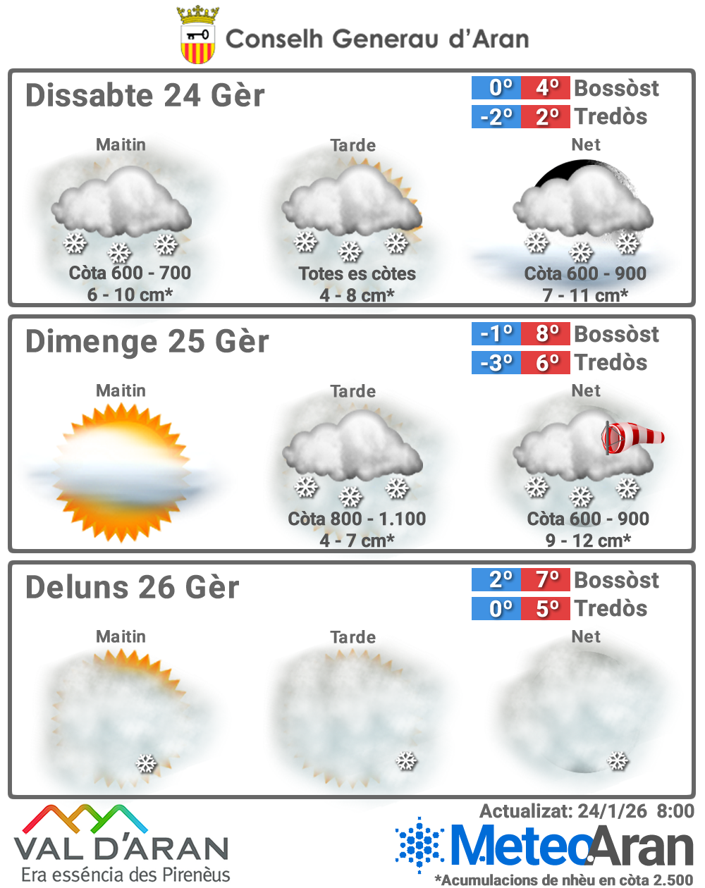 🌡️ -1 °C / 8 °C en Bossòst 🌡️ -3 °C / 6 °C en Tredòs.