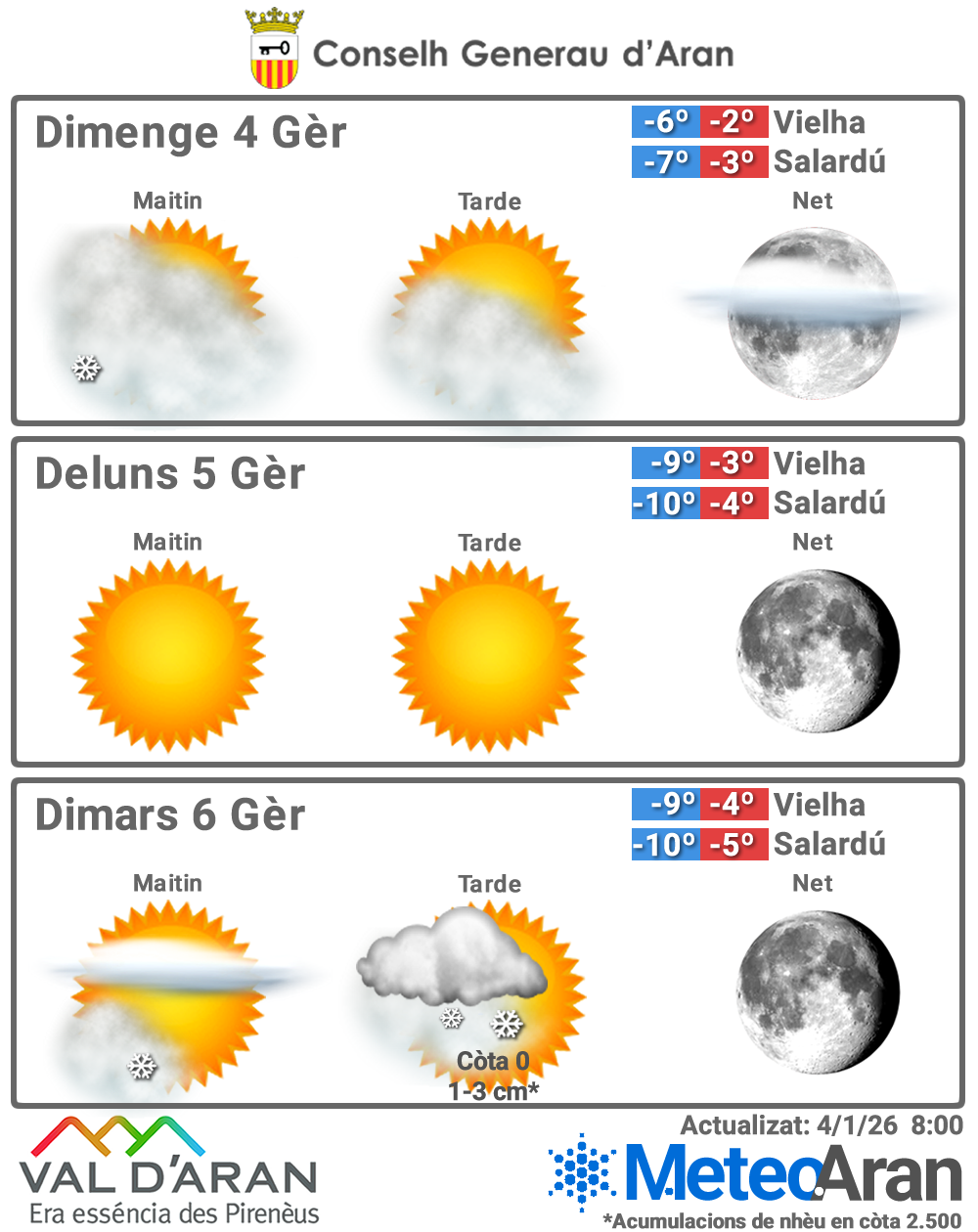 🌡️ –8 °C / –2 °C en Gausac · –10 °C / –3 °C en Bagergue.