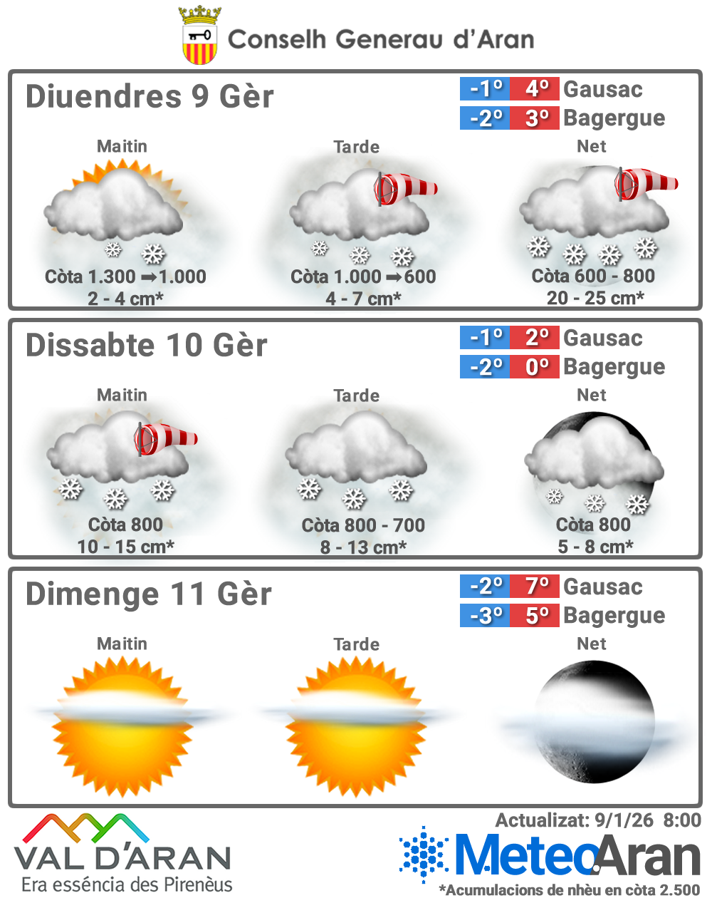 Día gris y frío, con nevadas prácticamente continuas, más frecuentes e intensas durante la mañana, cuando el viento del norte soplará con fuerza en cotas medias y altas provocando torbeig. Por la tarde, las precipitaciones seguirán presentes, algo menos intensas y algo menos persistentes, con la cota alrededor de los 700 m. Acumulaciones previstas de cerca de 30 cm en cotas altas 15 cm en fondo de Valle. La nevada irá remitiendo por la noche.