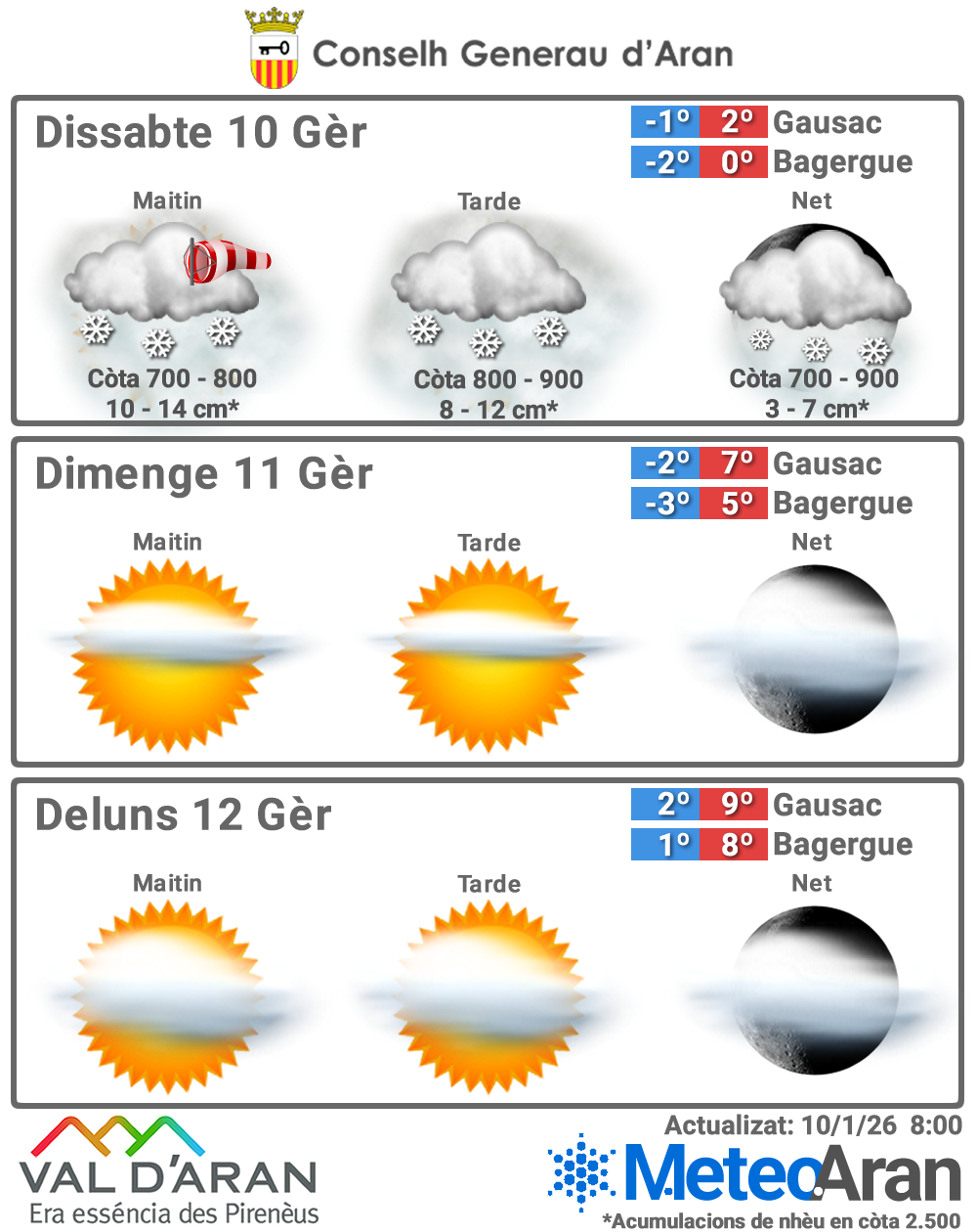 🌡️ –2 °C / 7 °C en Gausac. –3 °C / 5 °C en Bagergue.