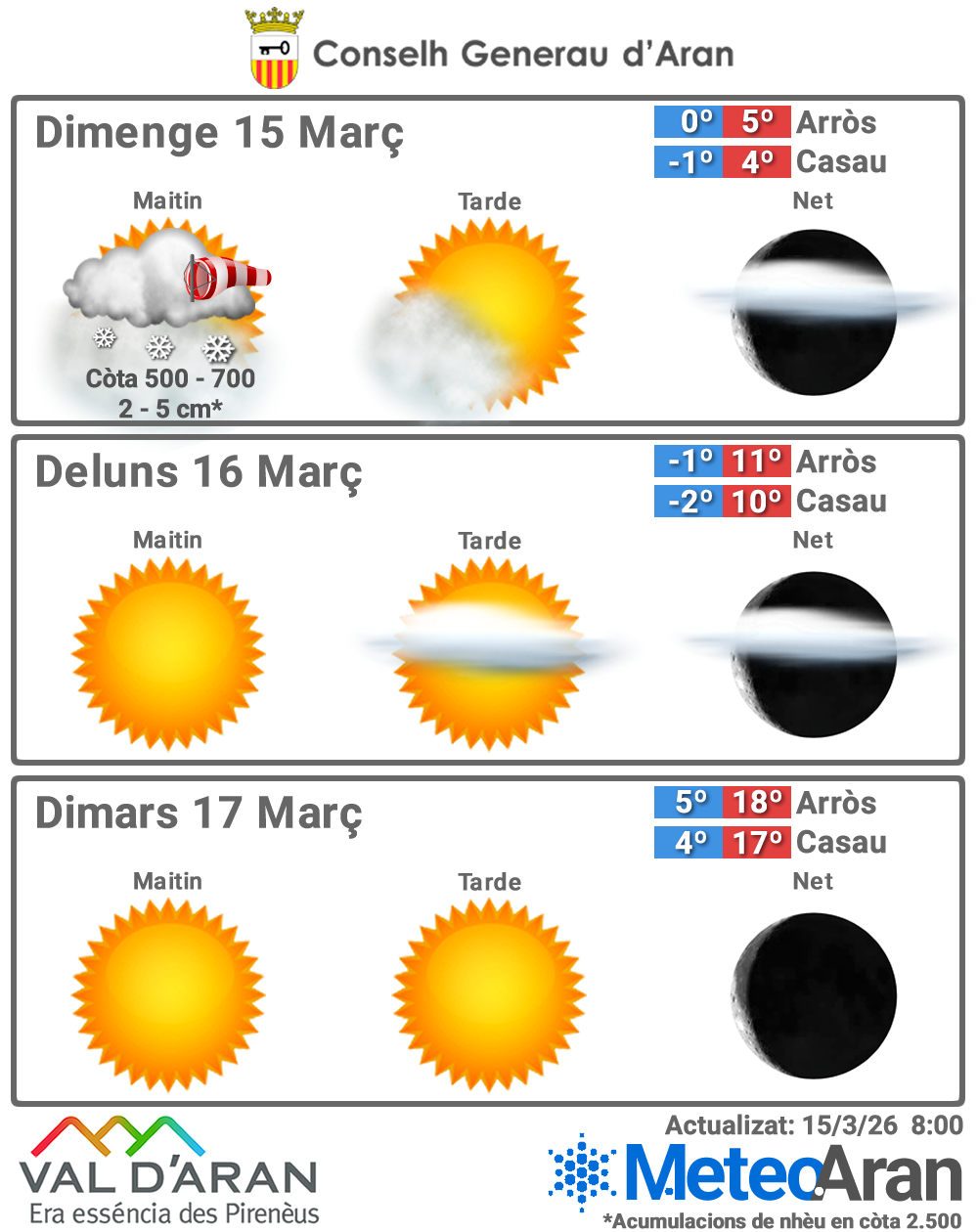 Durante las primeras horas de la mañana todavía se esperan nevadas débiles con una cota entre los 500 m y los 700 m, dejando acumulaciones de 2 – 5 cm.