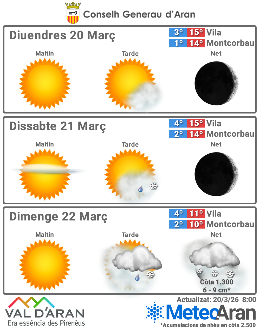 Aunque la mañana empezará con sol, durante la tarde y la noche el cielo se cubrirá, dando paso a un episodio de precipitaciones a últimas horas d ela tarde y durante la noche. La cota de nieve bajará de los 1.400 m a los 900 m, con acumulaciones previstas de menos de 10 cm. Vientos débiles del norte.