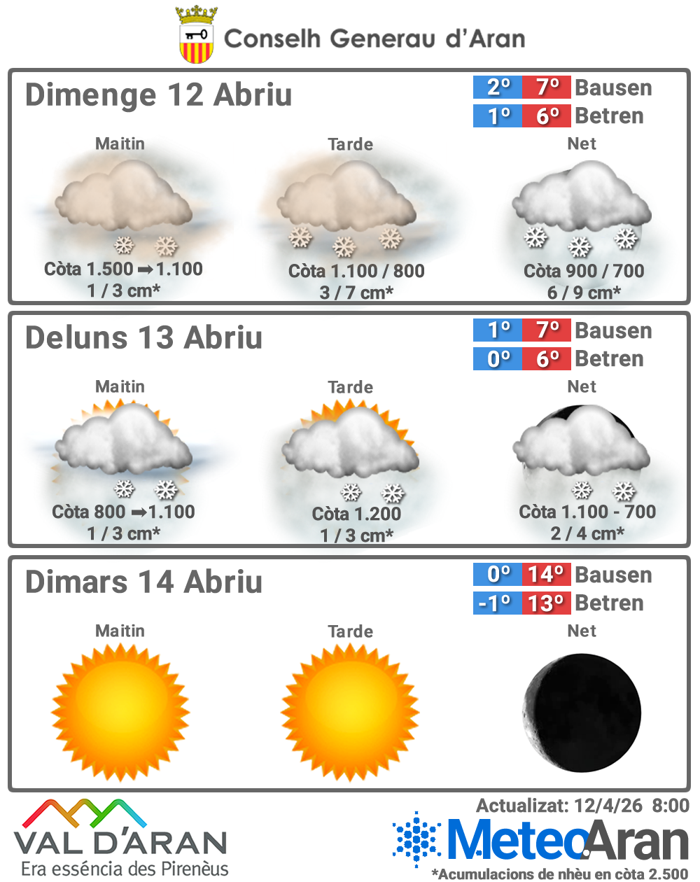 La inestabilidad persistirá con cielos nubosos y chubascos más débiles e intermitentes que el domingo. Cota de nieve entre los 800 y los 1.200 m y poca acumulación. Vientos del norte con alguna racha moderada.