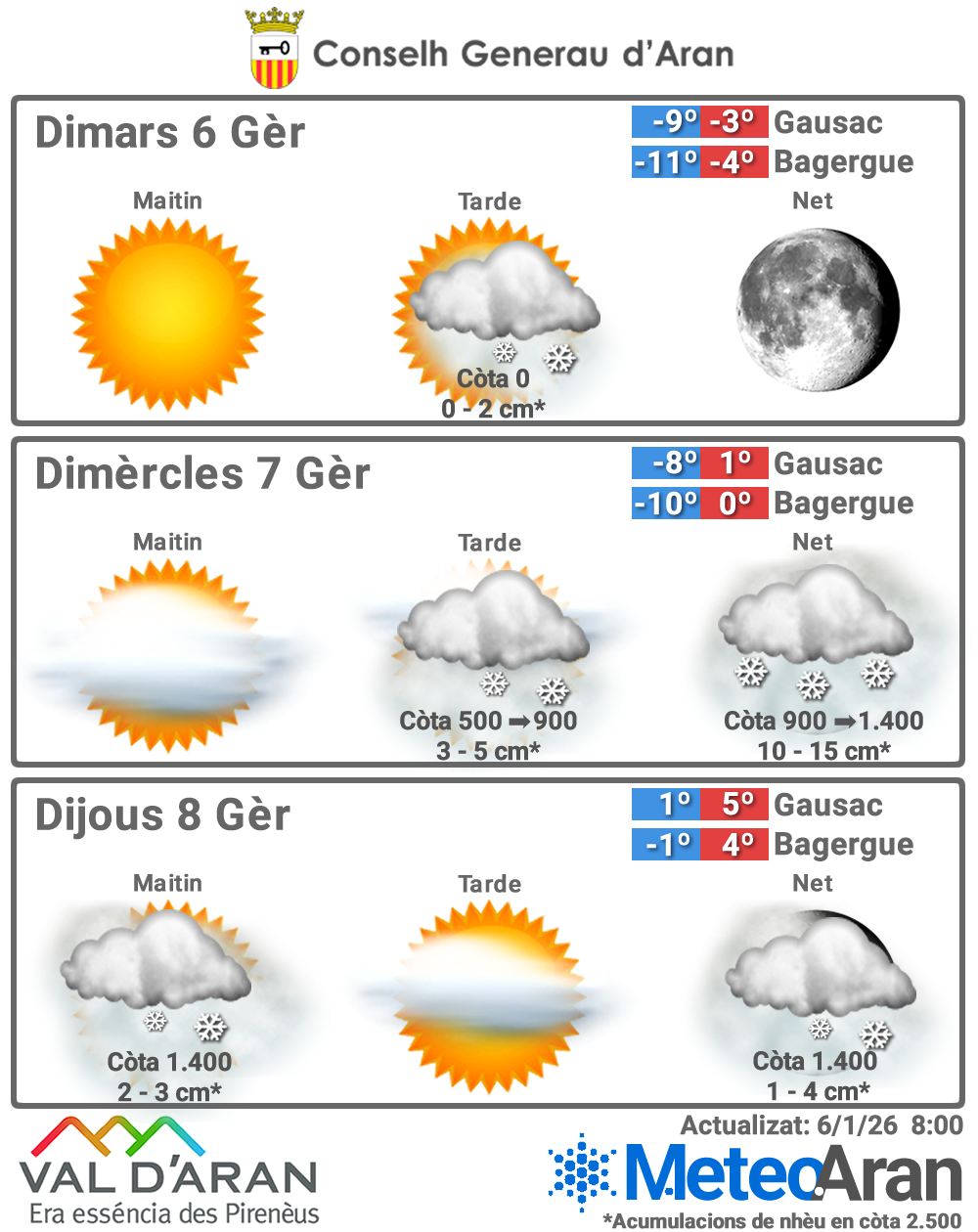 🌡️ –9 °C / –3 °C en Gausac · –11 °C / –4 °C en Bagergue.