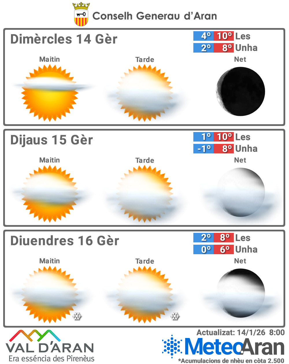 Descenso de temperaturas mínimas con algunas heladas en cotas altas y medias, diurnas sin cambios.