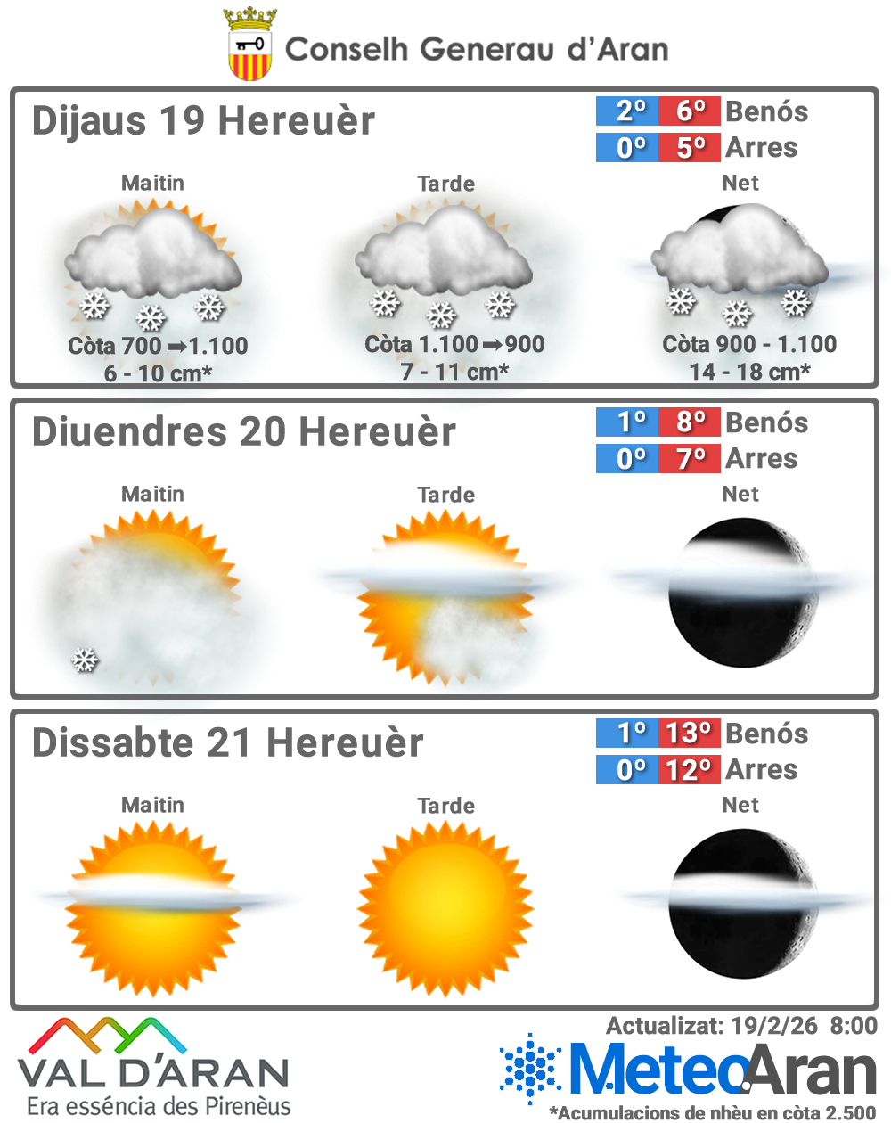Se esperan nevadas bastante continuas, que se intensificarán por la noche que podrían dejar acumulaciones de alrededor de 30 cm por encima de los 2.000 m hasta el amanecer. La cota de nieve oscilará entre los 700 m y los 1.100 m.