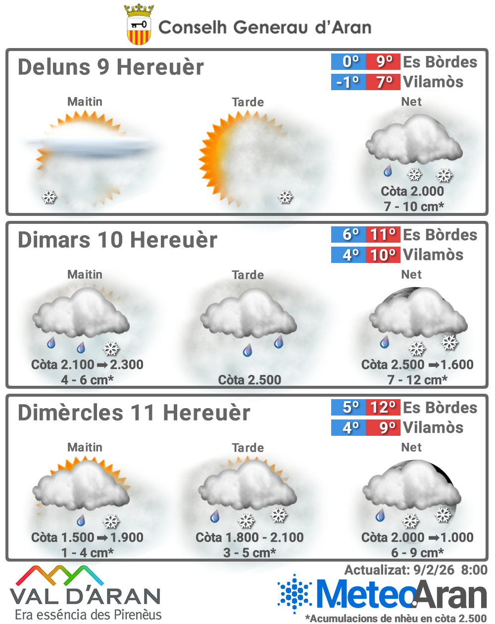 🌡️ 0 °C / 9 °C en Es Bòrdes 🌡️ -1 °C / 7 °C en Vilamòs