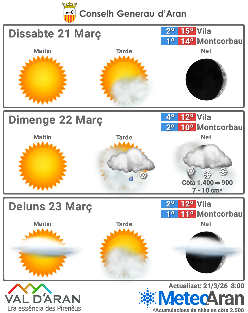 Aunque la mañana empezará con sol, durante la tarde y la noche el cielo se cubrirá, dando paso a un episodio de precipitaciones a últimas horas d ela tarde y durante la noche. La cota de nieve bajará de los 1.400 m a los 900 m, con acumulaciones previstas de menos de 10 cm. Vientos débiles del norte.